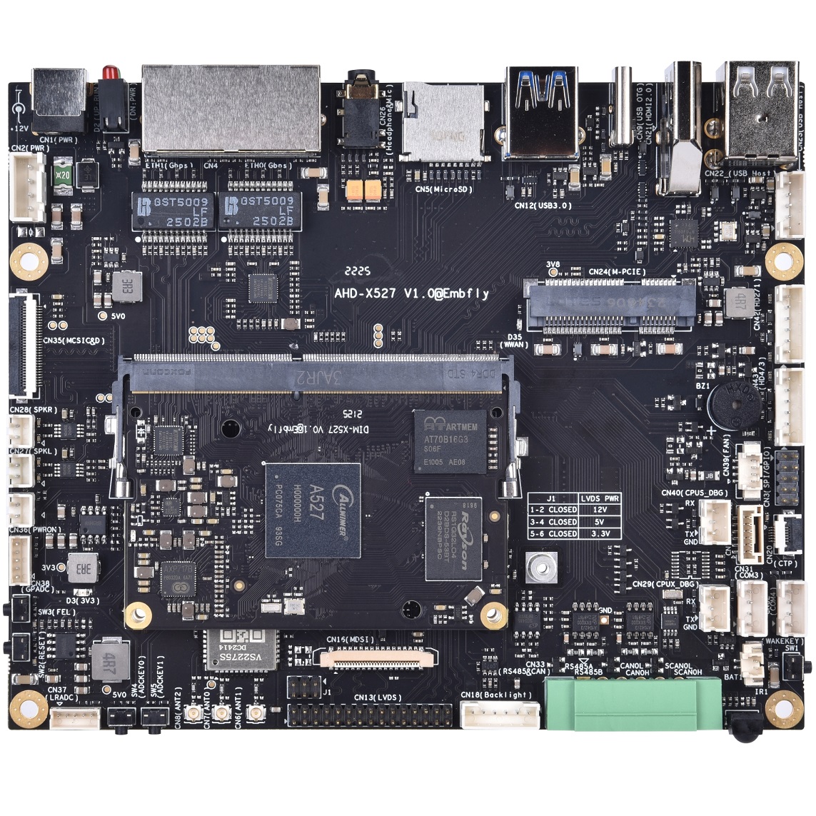 AHD-X527主板是DIM-X527核心模塊的工程底板的參考設(shè)計(jì),該產(chǎn)品集成了八核 Cortex-A55 2.0GHz(MAX) A527(T527)處理器,穩(wěn)定運(yùn)行Android 13.0/Ubuntu 20.04/Linux 5.15。 AHD-X527提供了3.3V I/O接口,可提供寬溫的工業(yè)組件,運(yùn)行于條件惡劣的工業(yè)現(xiàn)場(chǎng)!
