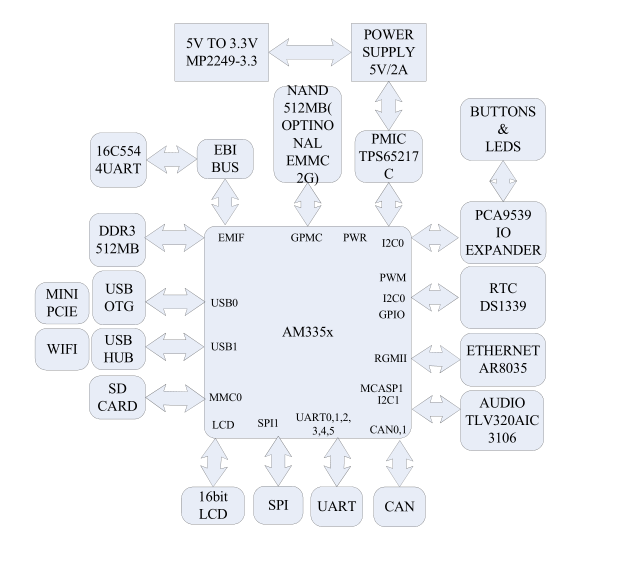 8. 串口包括:2 個控制器局域網端口 (CAN)6 個 UART,2 個McASPI,2 個 McSPI,3 個 I2C 端口