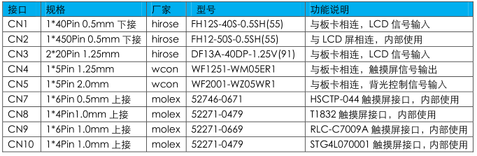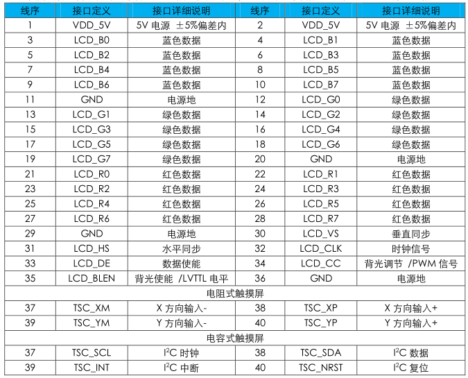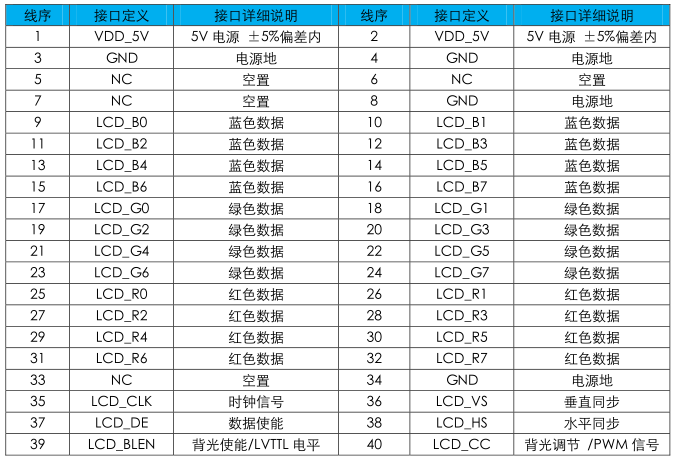 2.如使用其他廠商硬件開發平臺產品,請參考下表接線定義及開發平臺的LCD接口定義,并對應相連