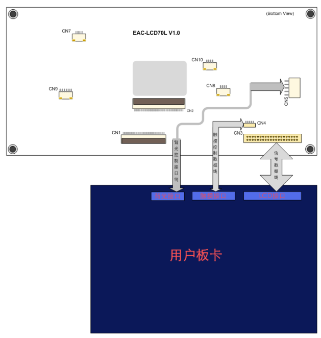 3.選用CN3時板卡與設配板接口接線示意圖如下:(觸摸控制連接到CN4,背光控制連到CN3或者獨立到背光控制接口CN5)