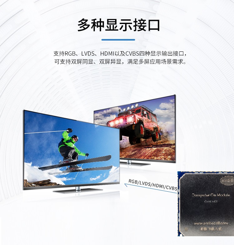 支持多種顯示接口RGB/雙LVDS/MIPI DSI/HDMI/CVBS/YPbPr/VGA,支持雙屏異顯1080P@60fps;