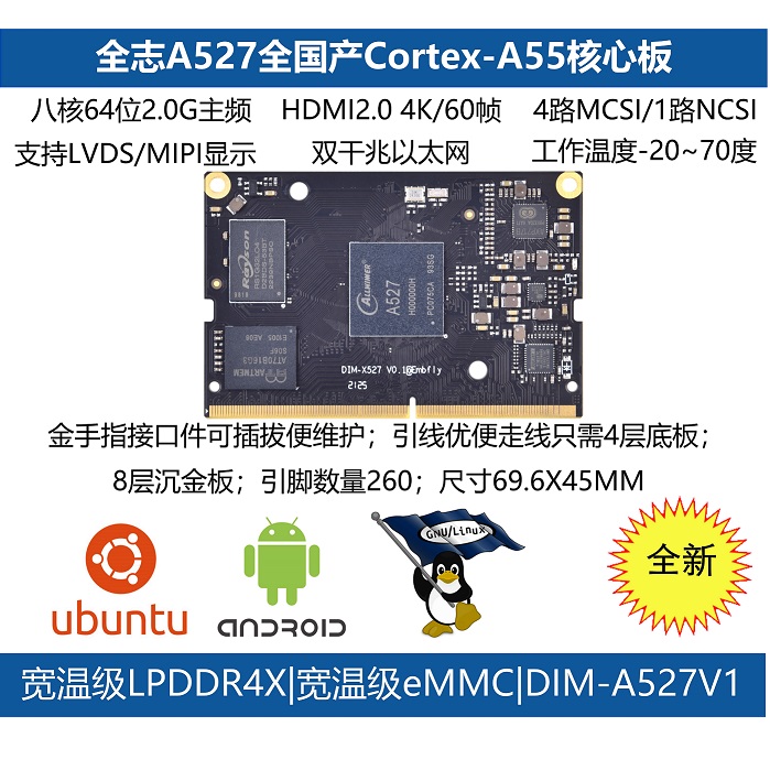 DIM-X527核心模塊屬于盈鵬飛嵌入式Computer-on-Module系列,該產(chǎn)品集成了八核 Cortex-A55 2.0GHz(MAX) A527處理器或者T527車規(guī)級處理器,穩(wěn)定運行Android 13.0/Ubuntu 22.04/Linux 5.15。