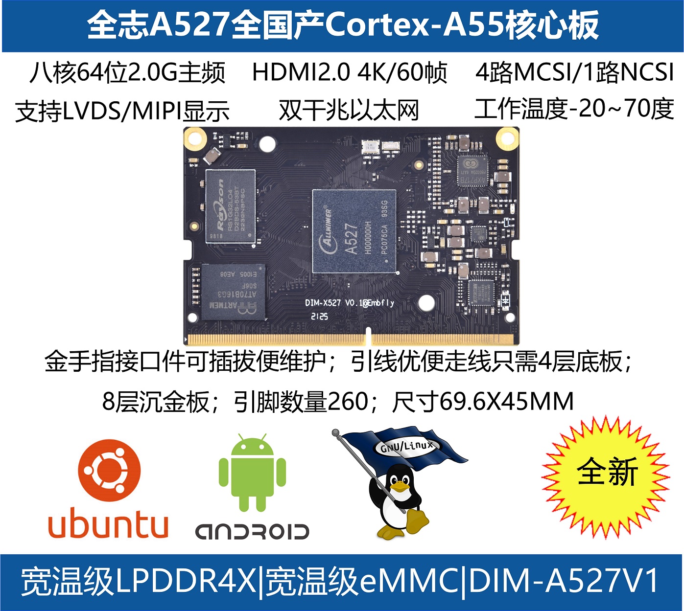 l采用Allwinner公司Cortex-A55八核A527/T527處理器,最高速度為2.0GHZ;