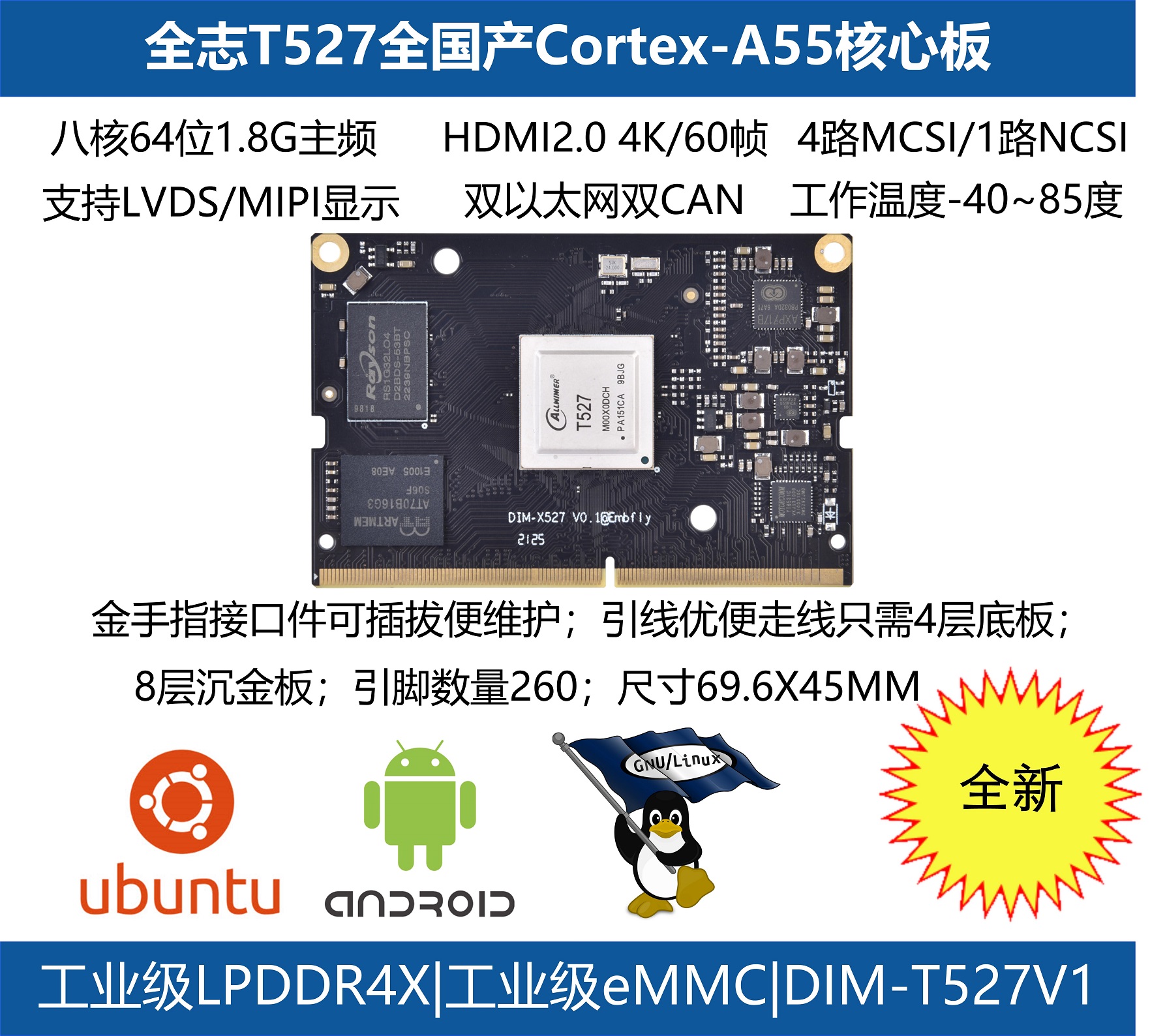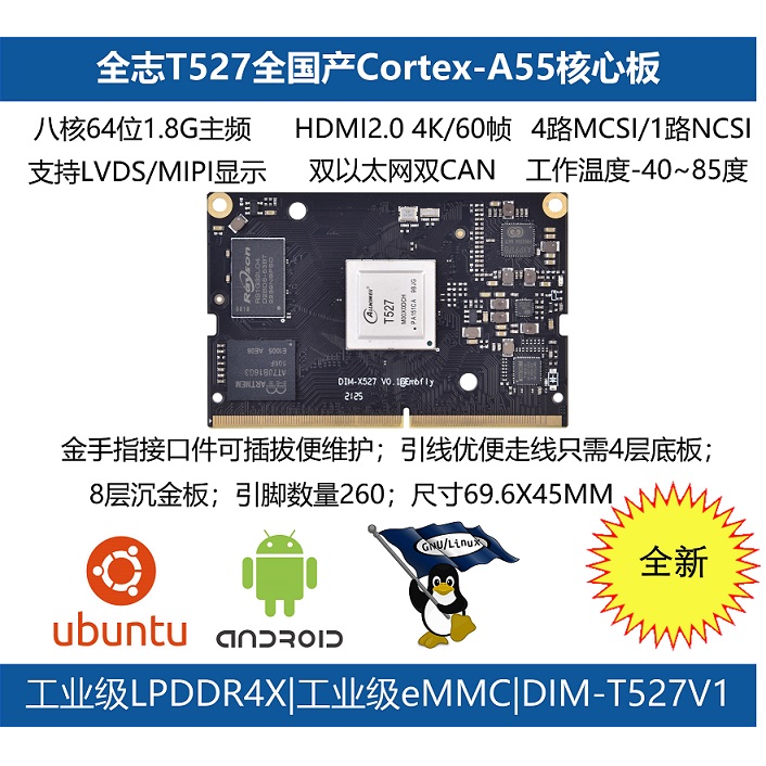 DIM-X527核心模塊屬于盈鵬飛嵌入式Computer-on-Module系列,該產品集成了八核 Cortex-A55 2.0GHz(MAX) A527處理器或者T527車規級處理器,穩定運行Android 13.0/Ubuntu 22.04/Linux 5.15。